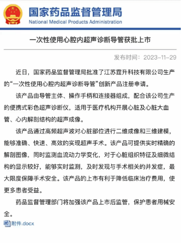 2025年5月14日,从国家药品监督管理局获悉, 霆升科技自主研发的 一次性使用心腔内超声诊断导管(型号:TINGSN Sonic Eyes 8 Eco) 正式获批(注册证号:国械注准20253060929),成为我国首个获批上市的8F国产心腔内超声(ICE)导管产品。适用于儿童治疗. 此次获批标志着国产心腔内介入影像技术迈入国际先进行列,为我国心脏病介入治疗提供更精准的"中国方案" 。